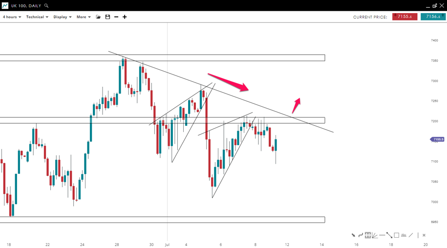 UK 100 broke the bearish pennant formation to the downside after testing the pivot level around the 7,200 mark. It seems the market is heading back to the same zone with positive momentum. If the price breaks the bearish trend line to the upside and closes above the pivot level, this could lead to a move upward to test the next key resistance level around the 7,360 mark.