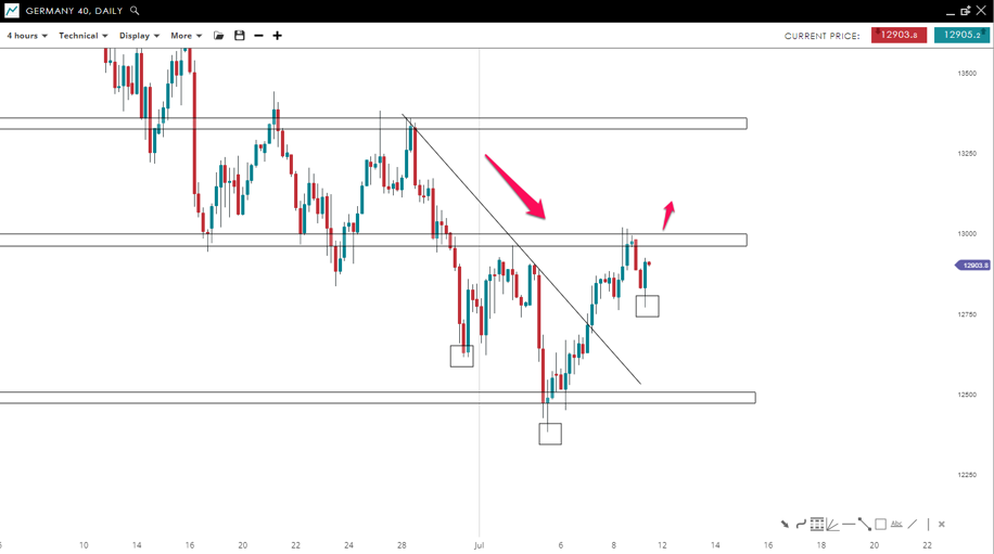 The price of “GER40” is trying to reverse to the upside by breaking the bearish trend line after posting an inverse head and shoulders pattern. The market is about to test the pivot level around the 12,985 mark, if it breaks and closes above it, GER40 could reach the 13,350 level.
