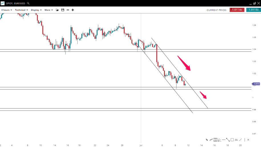 The EUR/USD is bouncing inside a bearish channel formation where lower highs and lows have been left. The market tested the 1.01 level (100 pips above parity) and failed to break it to the downside. A new move is about to test this area, if it breaks the pivot level to the downside the price of “EUR/USD” could reach the 0.99 mark.