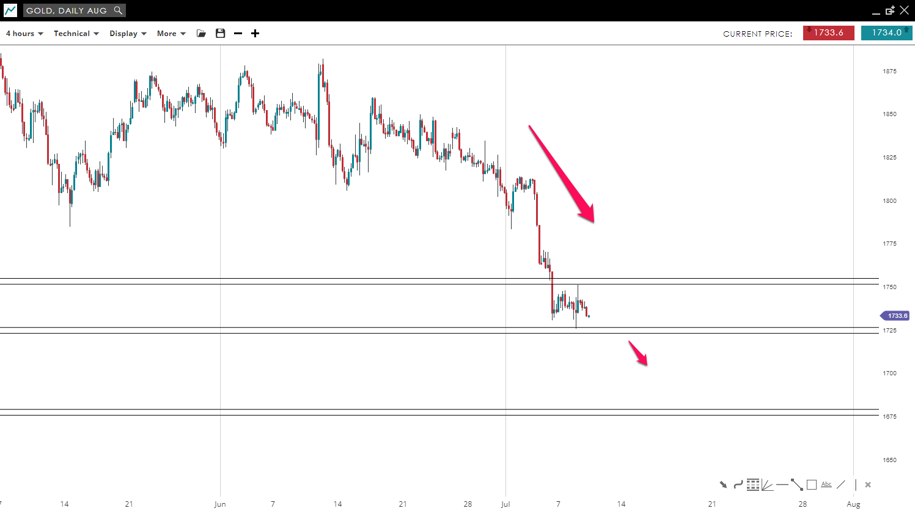 Gold is in a clear downward movement where lower lows and highs have been posted. The market is currently in a sideways movement where we expect a breakout to the downside of the pivot level. If this scenario occurs the market could reach the 1,675 support (formed by 2021 lows) by the end of this week.