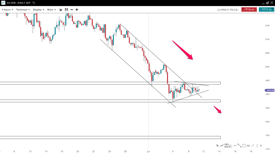 The price of “Silver” is trading inside a bearish channel formation where lower highs and lows have been posted. The market currently is bouncing inside a bearish pennant  pattern. Since we are in a downtrend, there is a high chance to see the price breaking the pennant pattern to the downside to reach the 1,740 mark.
