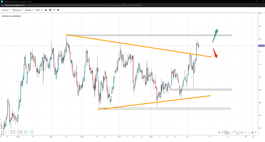 The stock price of Boeing appears to have completed a triangle pattern, with the measured-move opening the door to a final destination of $245 should the $230 resistance break. Currently, the stock is stuck under a double-top formation at $222, and it could slide lower towards $200 before peaking again if $208 softens. However, a break under $193 would invalidate the triangle.