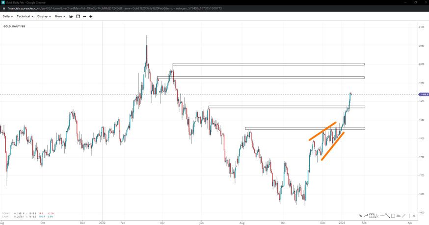 The price of gold broke to fresh multi-month highs after confirming a leading wedge pattern, bringing the 2k handle in closer proximity with a decent resistance at 1965. If gold bears regain control of 1880, a new downswing towards 1825 could be in the offing, and chances of remaining impulsive will decrease.