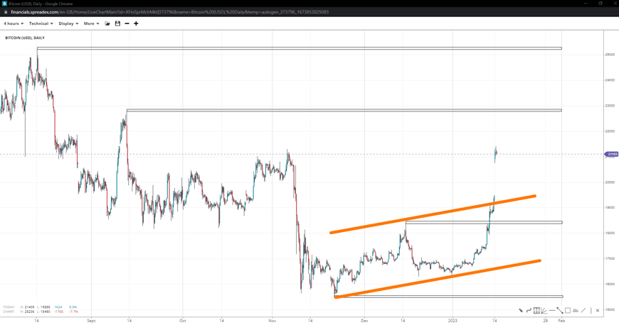 Bitcoin managed to break the 18400 resistance (now support) parabolically last week, heading towards 23k and perhaps higher. 20k is major round support of defence for bulls; otherwise, the risk of a bearish flag formation will increase, and the 15.5k could be revisited swiftly.