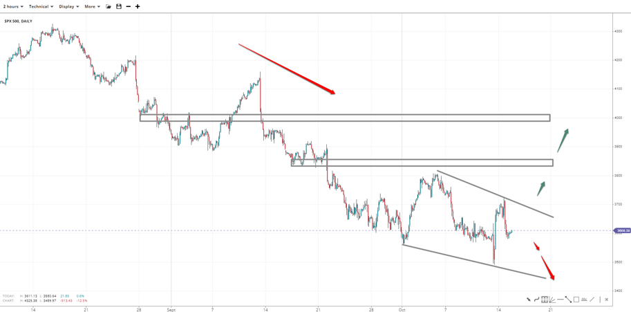 SPX 500 found support at 3500 but advanced only to 3720 before reversing. If the price continues to descend, reaching the lower diagonal trendline near 3450, the chances of an upside reversal will increase on a falling wedge formation. Retaking 3800 and 3850 paves the way to the 4000 handle.