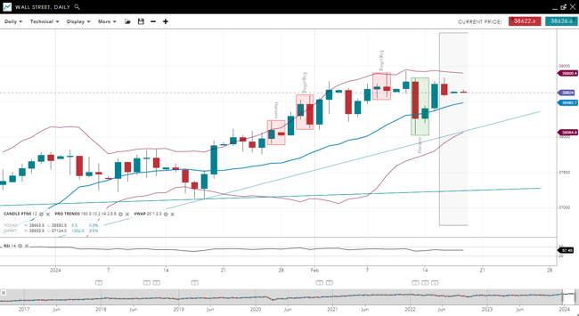 Wall Street is in an impulsive phase of a bullish trend, highlighted by its price above the upwards-sloping 20-period VWAP of 38,482. The support for this index is at 38,064, with resistance at 38,900. The RSI is at 57, indicating positive momentum.