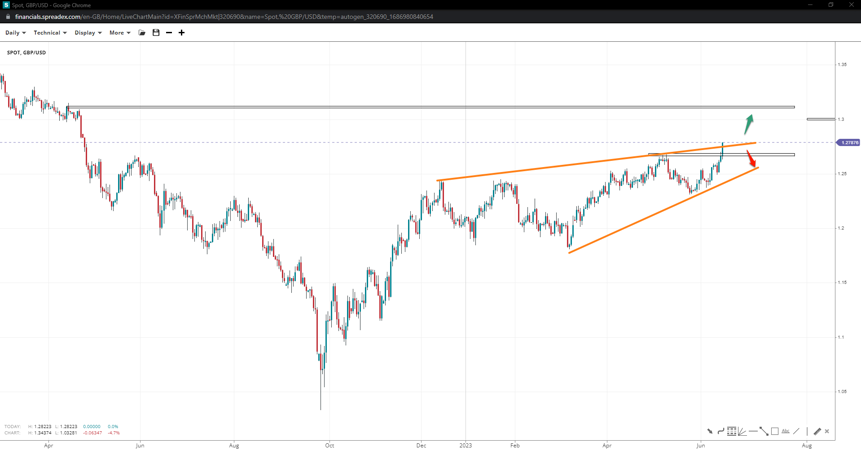 The daily chart of GBPUSD resembles a rising wedge that appears to have formed a throw-over above the upper trendline. If so, bears might step in soon, with $1.2680 seen as major support above $1.2487. A continuation higher won’t invalidate the rising wedge pattern but will likely restrict the price to $1.30, with little chance of breaking towards 1.3150.