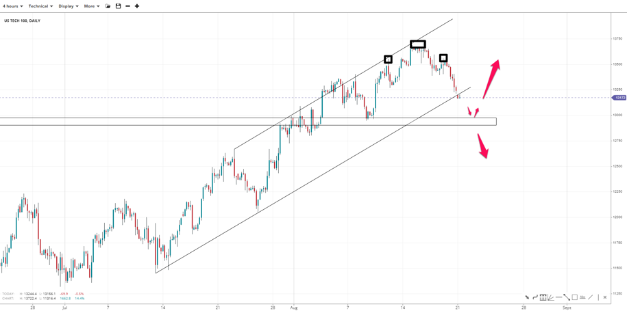 US Tech 100 successfully broke below the ascending channel after posting a high near 13,700. The market is heading toward the 13,000 mark to correct and complete a head-and-shoulders pattern. Further downside movement could lead to the 12,750 mark and a potentially larger head-and-shoulders pattern. A close back within the channel would counter bearish sentiment above 13,400 and could see the top revisited.