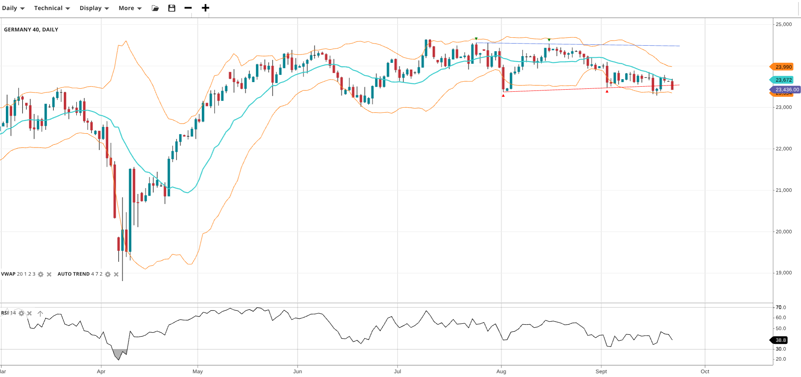 Germany 40 is in a neutral range phase, trading at 23,436, staying below its VWAP of 23,672. RSI at 39 reflects weakening momentum and a possible range break to the downside. Support is at 23,400, with resistance at 23,990.