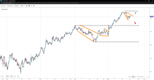 Eurostocks 50 is in a clearly defined uptrend, with the consolidation originating at  4200 forming a pennant. If the index reclaims the top, we could see the pattern come through and higher prices towards 4300. But further weakness could see a flag print instead, with the 4k handle back in the spotlight.