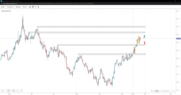 Gold continued to ascend as it ended a short-term consolidation phase, with the 2k handle now within short-term reach. If bulls fail to take over 1965, prices could soften towards 1880 and 1825 in a downward spiral case.