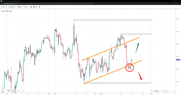 Wall Street accelerated to 34400, met stiff resistance and reversed below the base trend. The support at the 33k handle repelled bearish price action, leaving back only a failure pattern, and it is currently recovering. It could reclaim the 34k handle and upper trendline if it remains within the channel. Otherwise,  slide to 32500.