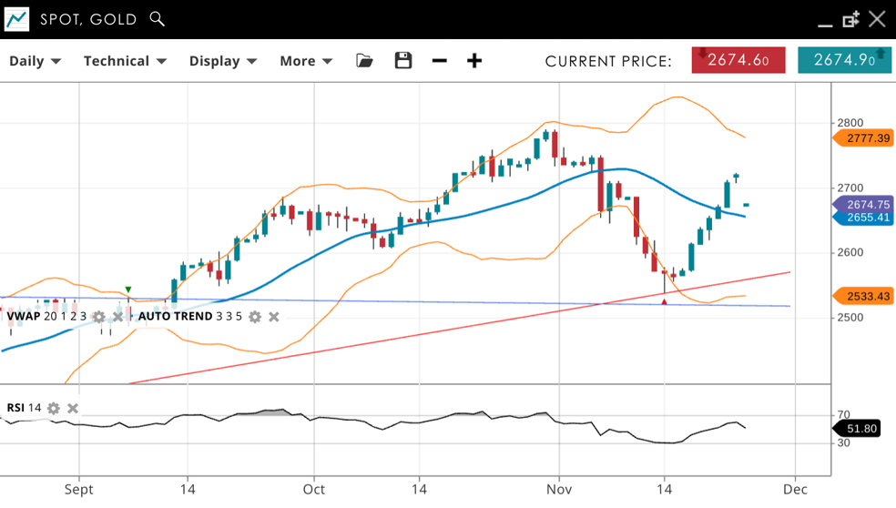 Gold remains bullish but is in a correction phase after a quick rebound from a steep correction - now trading at 2,674, back above the VWAP (20) of 2,655. Support is positioned at 2,533, with resistance at 2,777. The RSI at 51 indicates neutral momentum as the metal consolidates within its broader uptrend.