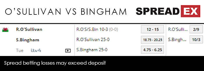 As for non-ranking events, O’Sullivan also picked up wins at the Shanghai Masters in September and the Champion of Champions tournament in November, with a silver medal at the Masters in January. To be fair to Bingham, he hasn’t done too badly for himself either. He was victorious over Mark Davis in October’s English Open, and triumphed against Ryan Day last weekend in the Gibraltar Open, while he was runner-up in the Welsh Open after losing to Robertson. Predictably the Rocket is the favourite, with Spreadex offering an O’Sullivan/Bingham Frame Supremacy spread of 12-15, where the winner receives 120 points plus a further 3 points for each frame the game is won by. O’Sullivan also sits odds on at 2/9 to his opponent’s 10/3. And remember, you can watch the fixture live here!