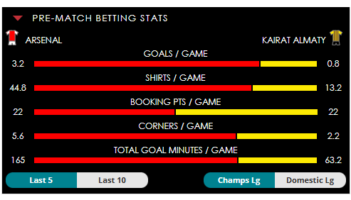 To see all the Arsenal v Kairat Almaty betting stats and form, visit our pricing page to view our Pre-Match betting stats table or hover over/tap the chart image to see previous outcomes for that particular market.