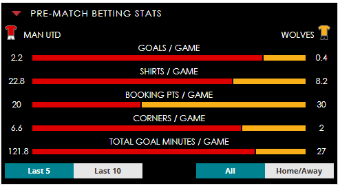 To see all the Man Utd v Wolves betting stats and form, visit our pricing page to view our Pre-Match betting stats table or hover over/tap the chart image to see previous outcomes for that particular market.
