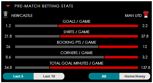 To see all the Newcastle v Man Utd betting stats and form, visit our pricing page to view our Pre-Match betting stats table or hover over/tap the chart image to see previous outcomes for that particular market.