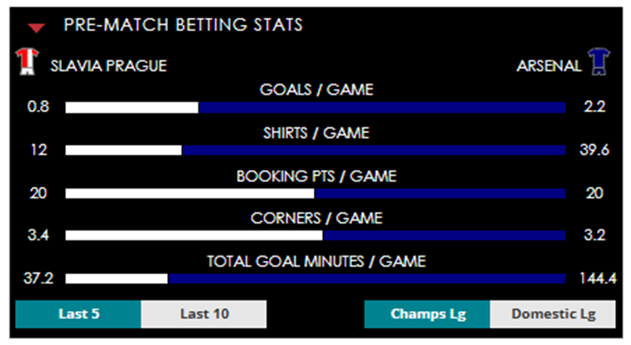 To see all the Slavia Prague v Arsenal betting stats and form, visit our pricing page to view our Pre-Match betting stats table or hover over/tap the chart image to see previous outcomes for that particular market.
