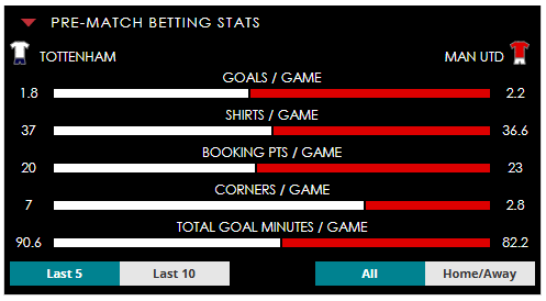 To see all the Tottenham v Man Utd betting stats and form, visit our pricing page to view our Pre-Match betting stats table or hover over/tap the chart image to see previous outcomes for that particular market.